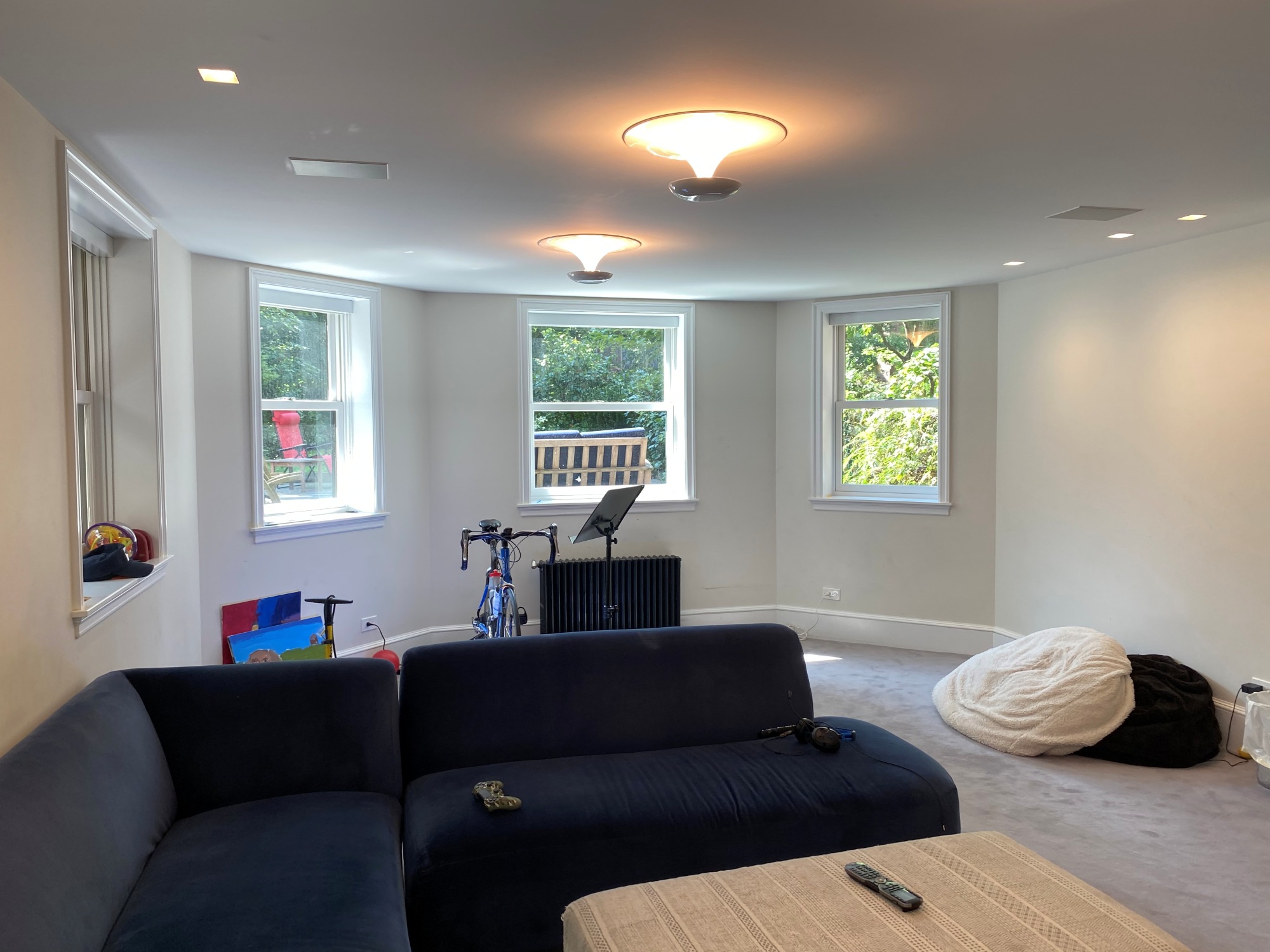 The space suffered from a lack of connection to the rear yard. By converting a window into wide, glass French doors, we provided direct access to the patio. New steps gradually make their way up to the rear yard. This new access point connected the garden level to the outdoors, and updated furnishings completely changed the feeling of the entertainment room.