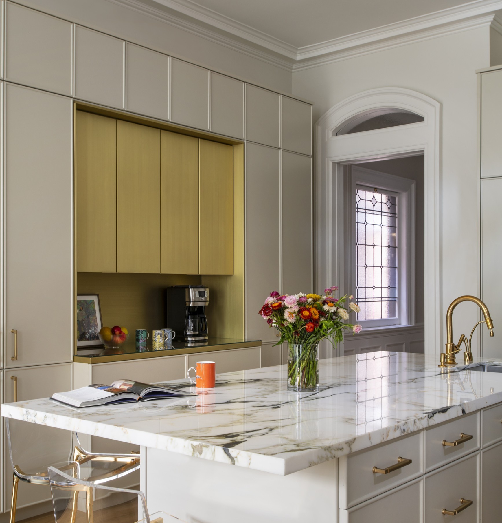 The millwork is a blend of painted cabinetry and metal, perfected through collaboration with the artisans at SMR Craftworks. Calacatta Noir marble countertops from BAS Stone are treated with MORE AntiEtch slab treatment to protect them from etching and staining.