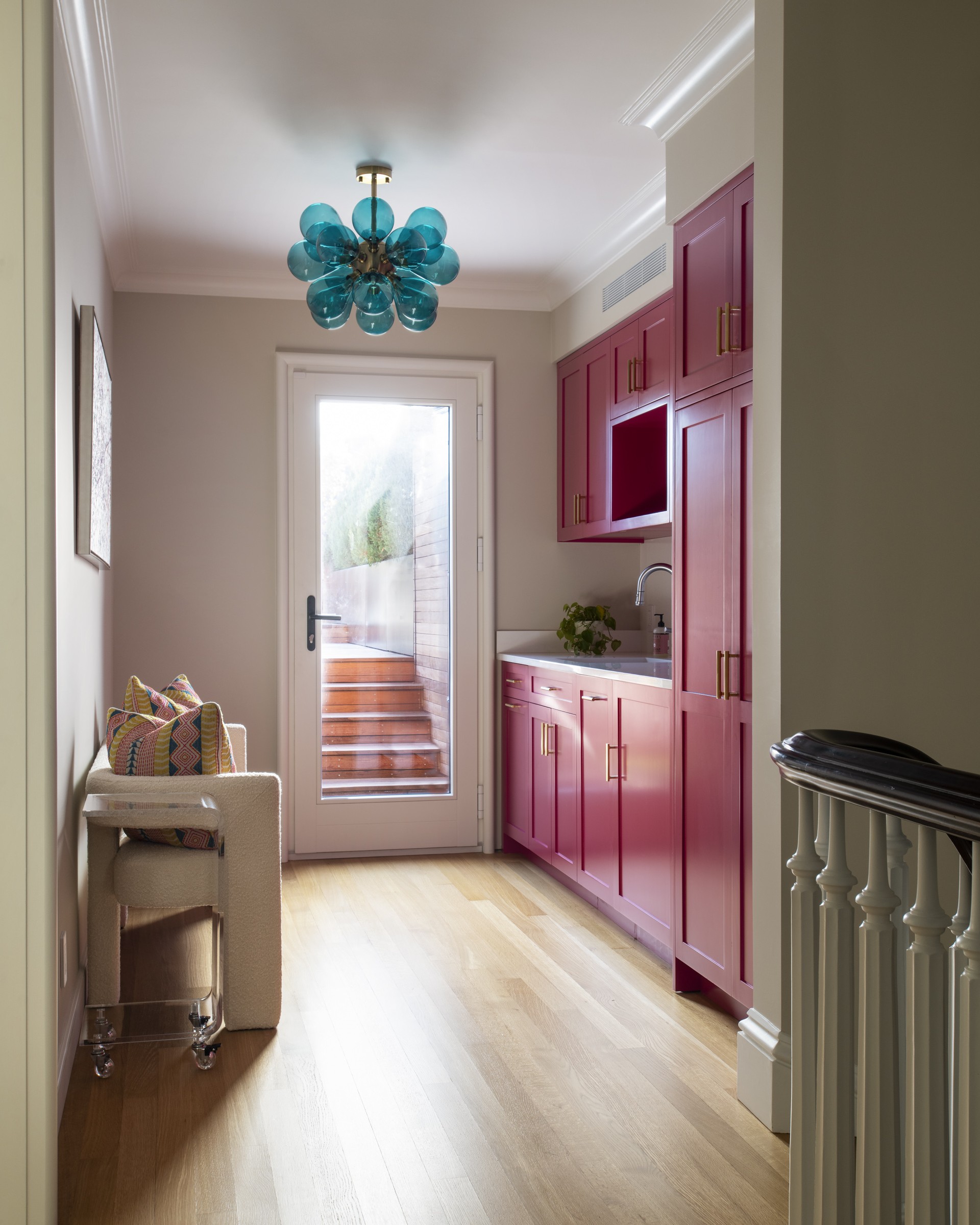 In the wet bar area, pops of color in the pink cabinetry and blue light fixture make the space shine.