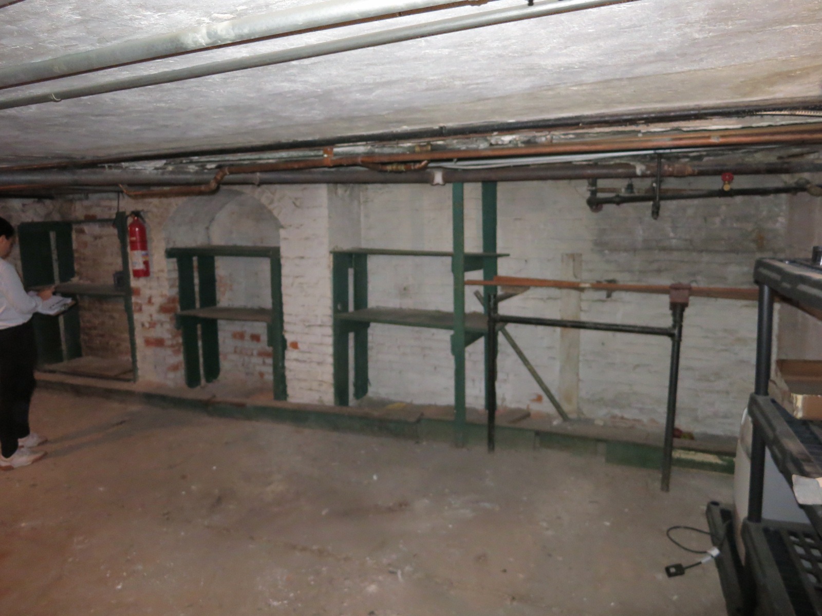 The cellar's potential was unlocked by excavating roughly two feet. To do this, we underpinned and repointed the brick archways and created a bench footing below the original stone foundation walls. Bench footings are ledges created around the outside walls of the cellar, leaving the original footing intact. Benches provide a number of design opportunities; in this case, the bench was used as a landing off the staircase, a storage opportunity, and an integral feature of the wine cellar.