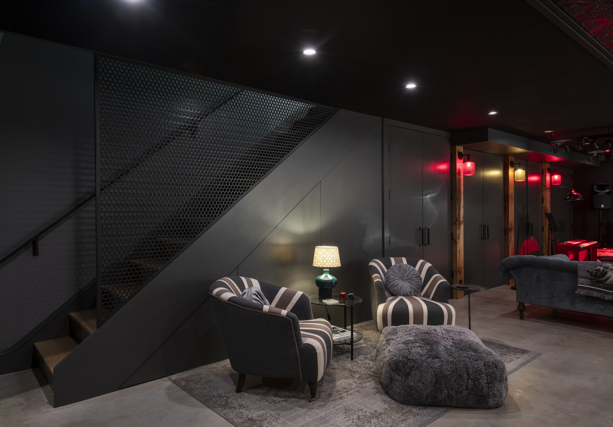 At the rear of the floor, a performance space is complete with a sound system and acoustic tiling on the ceiling. These elements ensure that audio quality within the space is high and prevent noise leakage to the rest of the house and the neighbors.