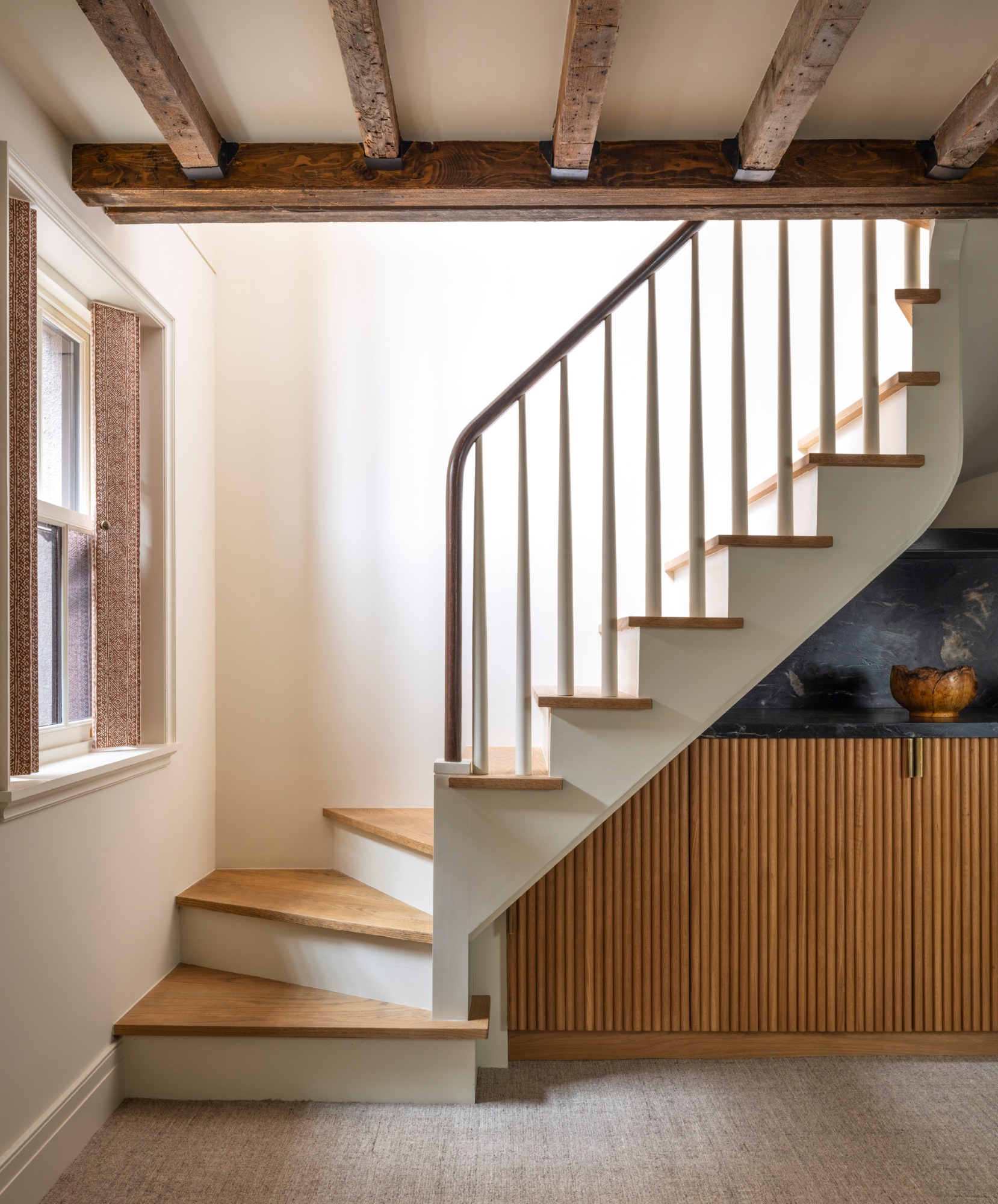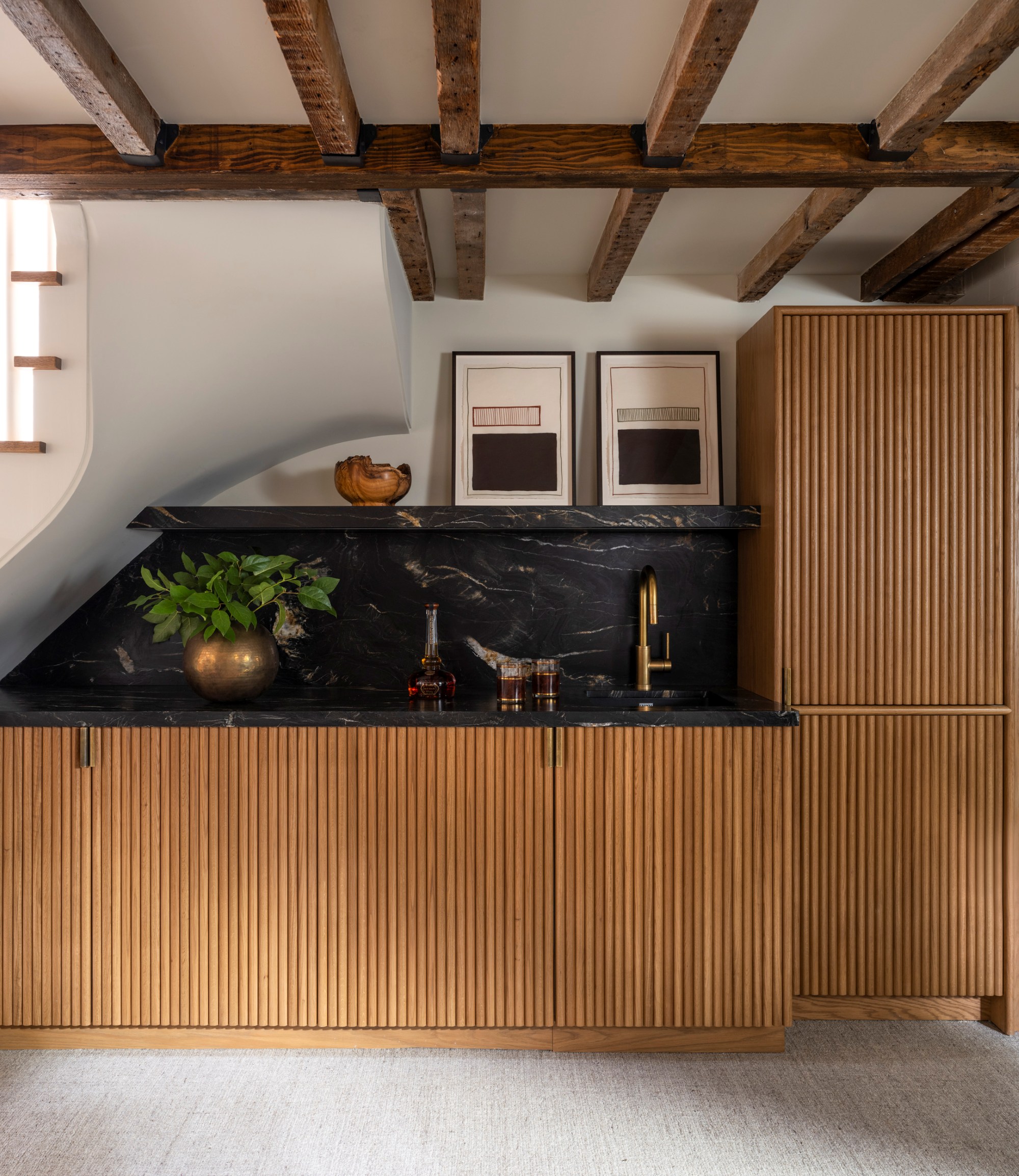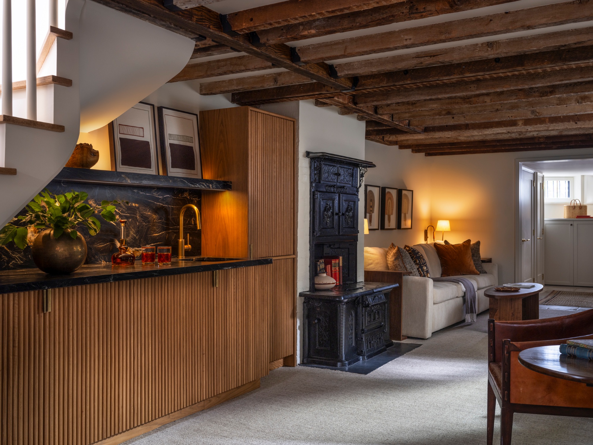 Sometime a simple decision, like reorienting a staircase, unlocks opportunities on multiple floors. In this case, it not only allowed for better circulation on the upper to create a more comfortable staircase and gracious entry into the cellar space, but it also created the perfect location for custom fluted wood cabinetry and leathered quartzite countertop and backsplash to house a wet bar and storage for the grandchildren's toys.