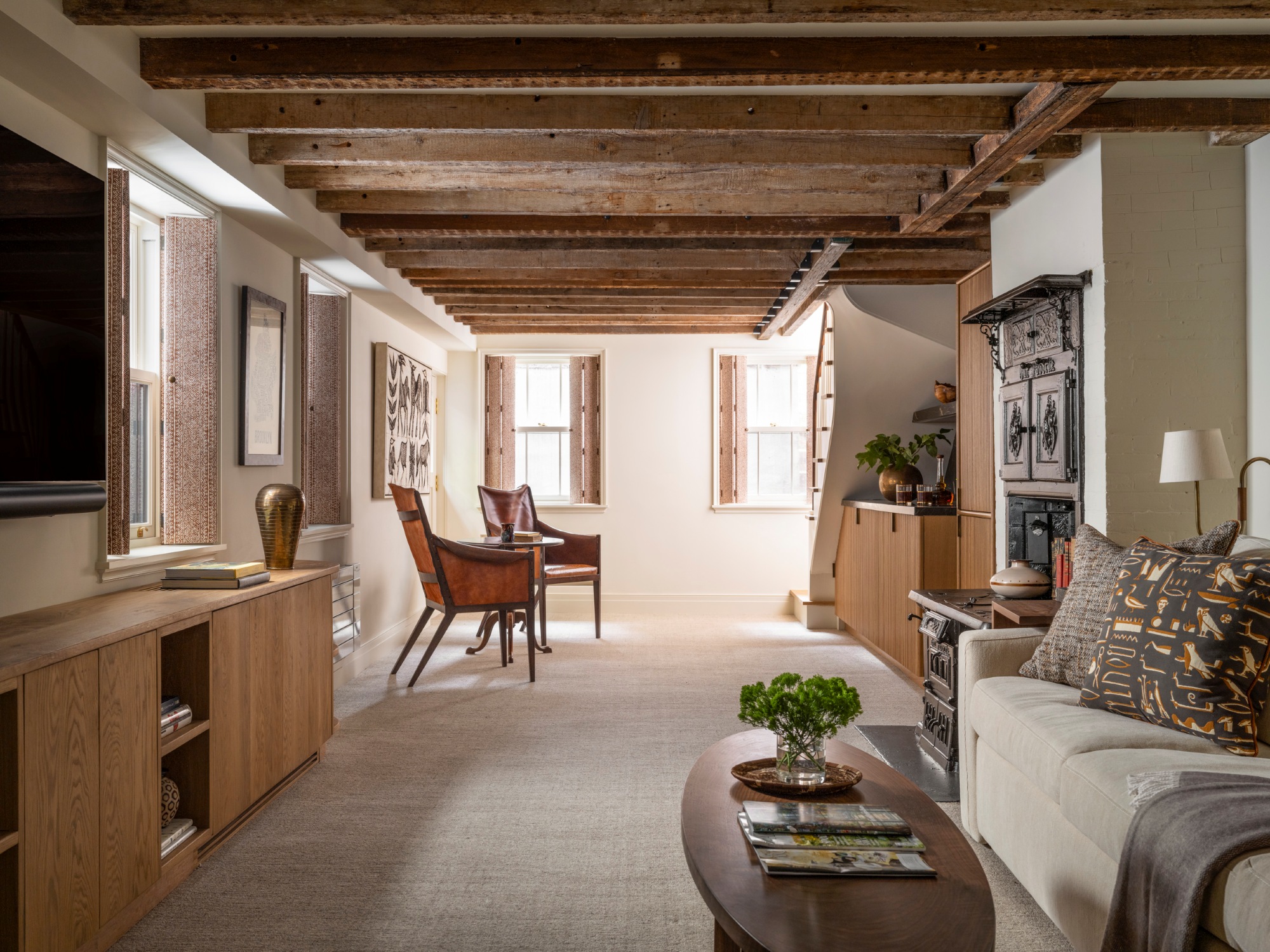 In this Cobble Hill Queen Anne townhouse, removing unnecessary walls, consolidating mechanical equipment, and exposing the existing joists provided the opportunity to create an inviting family room for three generations to enjoy. Once considered a dark and scary cellar floor by the young grandchildren, who would rarely spend time there alone, the existing space did not take advantage of the three exterior exposures that cellars rarely have. Our goals were maximizing natural light and creating a more open layout with different zones that flowed seamlessly into one another. Exposed beams and carpet unite the zones, creating an environment that is both cozy and practical. We worked closely with Charleston-based Cameron Stewart Design & Historic Preservation to select finishes that were durable, warm, and elevated and Taffera Fine Building & Finishes on implementation.