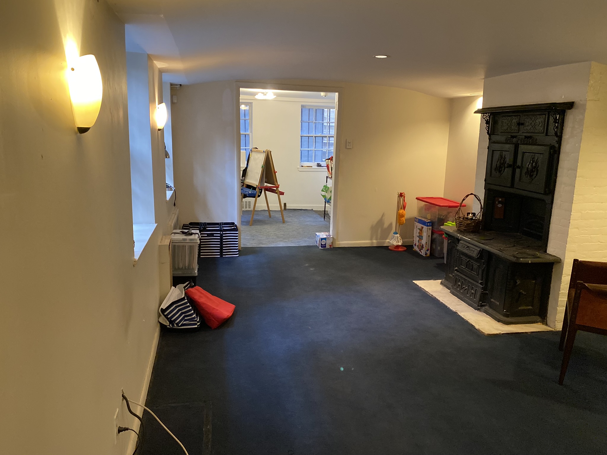 At the center of the floor, we wanted to keep the original 1888 Richard & Boynton stove in place, as a nod to the home's history and to use it as a decorative element to anchor the living room on one side and play space on the other. A cozy living area with custom cabinetry, which in part conceals the HVAC, provides the perfect spot for family members of all ages to relax. This HVAC and millwork solution is a great example of how modern mechanical systems that help eliminate ductwork and other elements can make large open spaces possible.