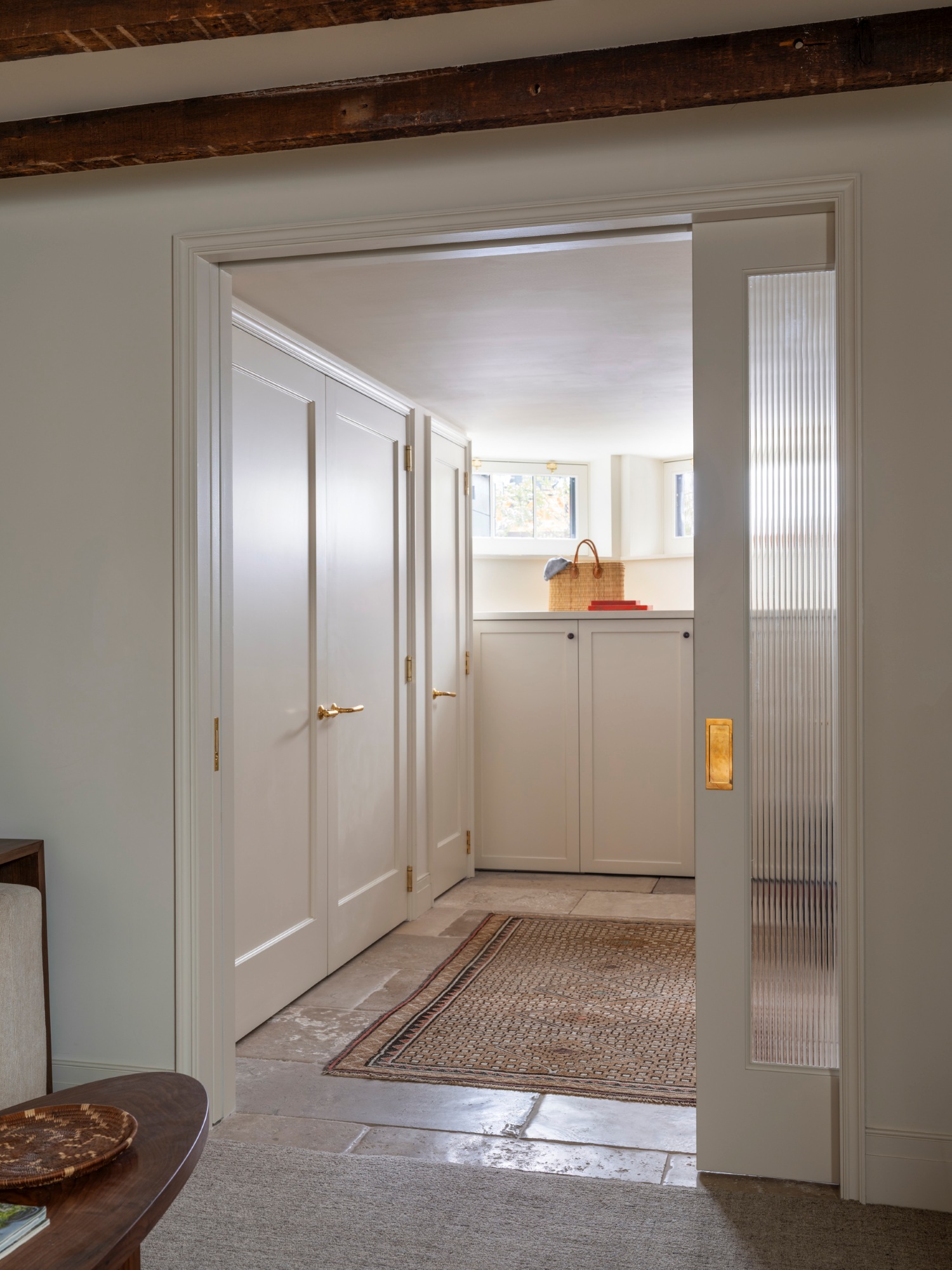 Light is precious on cellar floors, which are mostly below the exterior grade, and having spaces where you can see light throughout, from front to back, greatly impacts how you enjoy a space. When we started the project, the mechanical room at the front of the cellar floor was unfinished, disorganized, and far from an inviting entryway. By upgrading the systems and reorganizing the space, we were able to hide mechanical equipment in closets and behind custom millwork. In doing so, we were able to create a combined mudroom and mechanical room. A new pocket door with fluted glass allows the entry to be fully closed off from the entertainment spaces while pulling light into the center of the space.