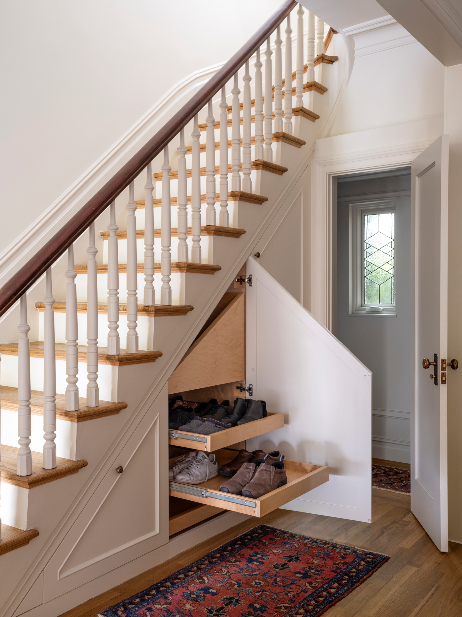 The house is widest at the front, before giving way to an areaway that allows natural light to enter the rear of the house through side windows. Cabinetry under the front staircase provides much needed storage space without sacrificing floor area in the entryway.