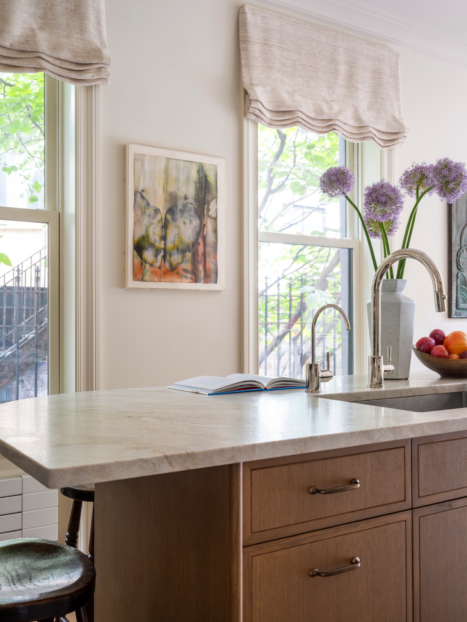 Although this house is narrower than most townhouses, measuring only about eleven and a half feet in width at the rear, it has the luxury of windows on one of the side façades. These windows allowed us to flip the standard configuration, moving the kitchen into the middle of the floor and the dining room to the rear.