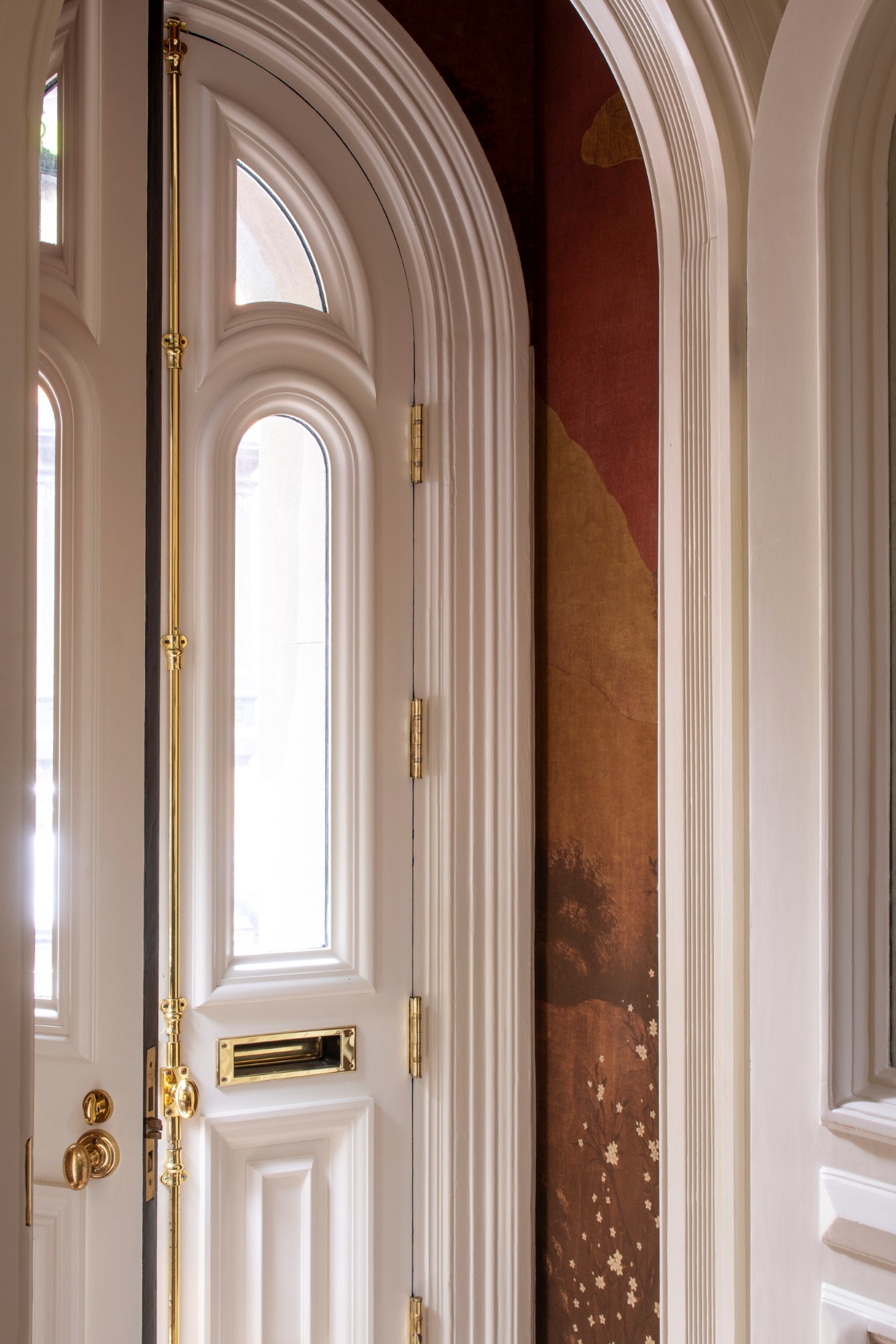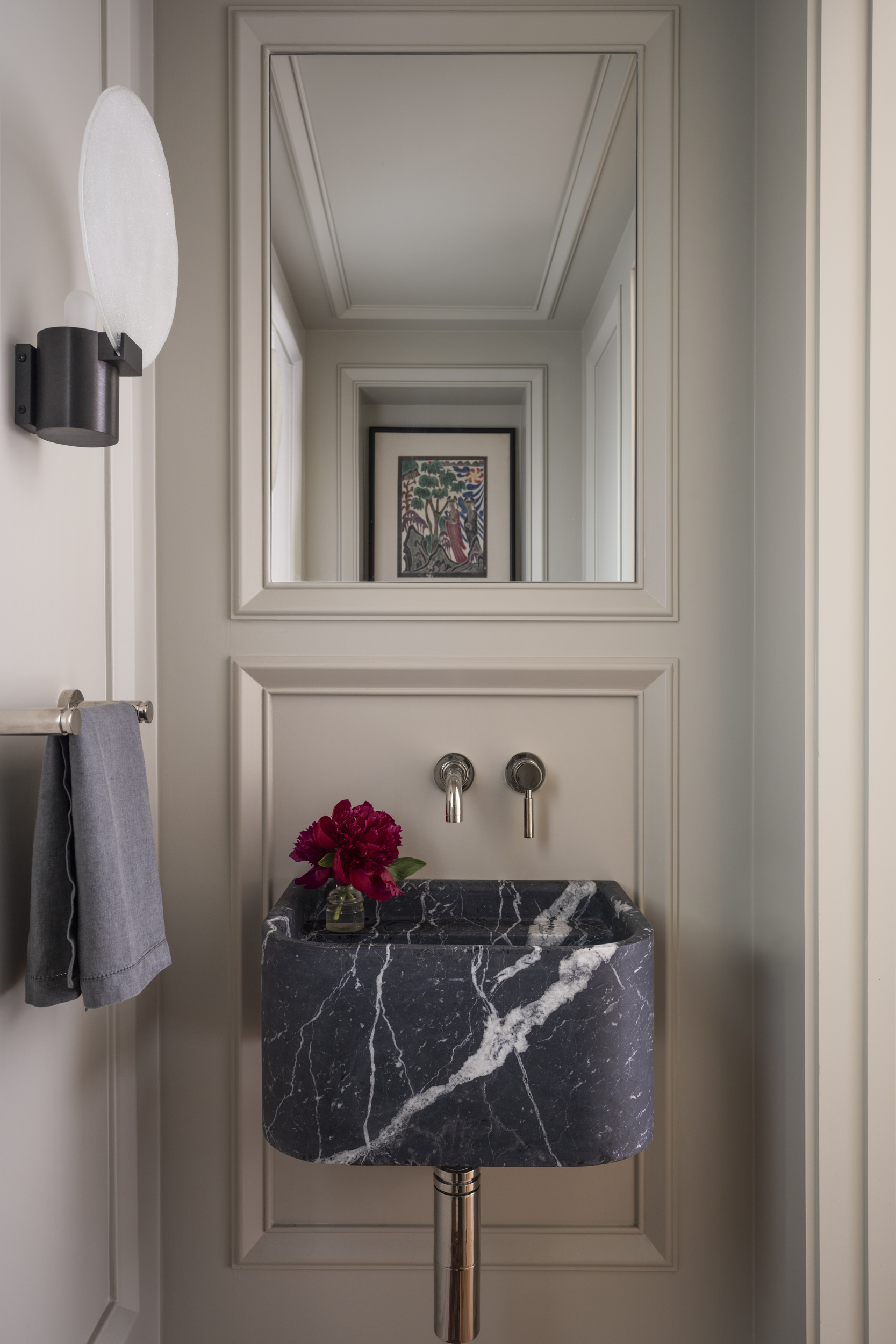 A powder room with a custom carved Nero Marquina marble sink and paneling along the walls and ceiling is also tucked underneath the staircase. A small leaded glass window provides both privacy and natural light, taking advantage of the building's L-shaped footprint.