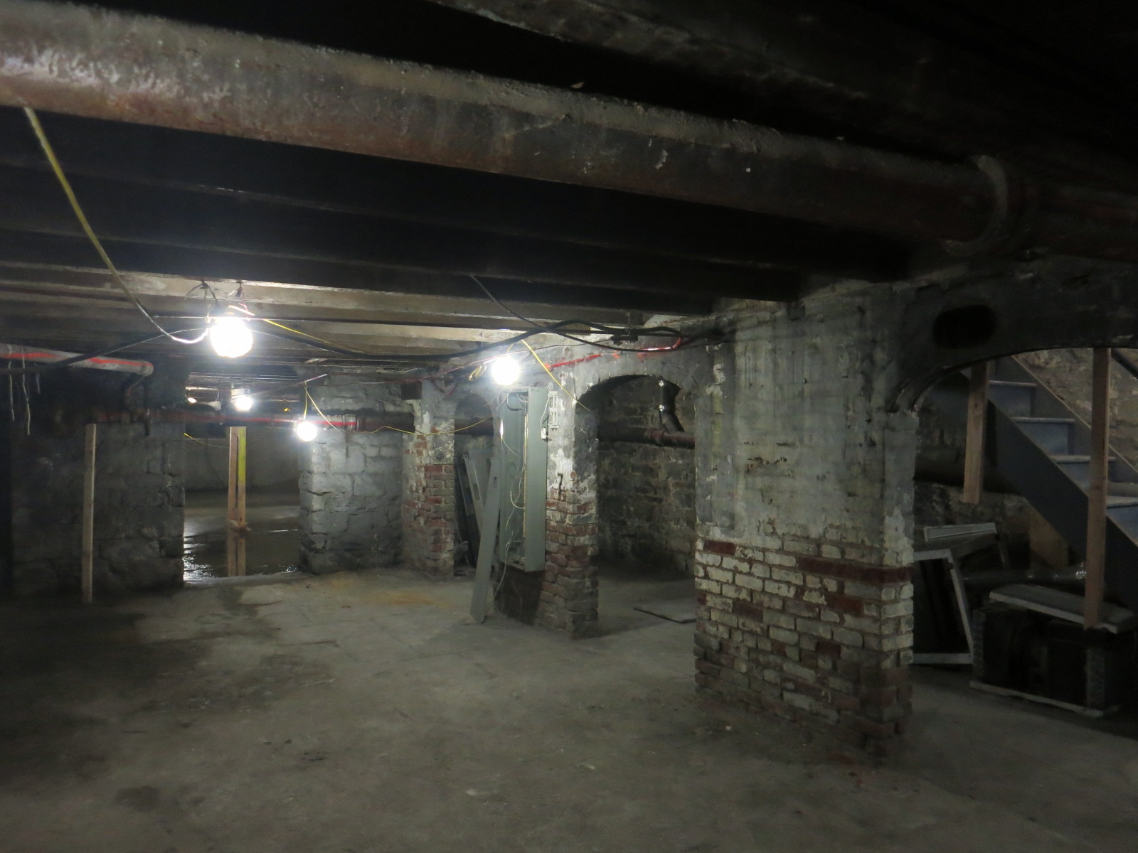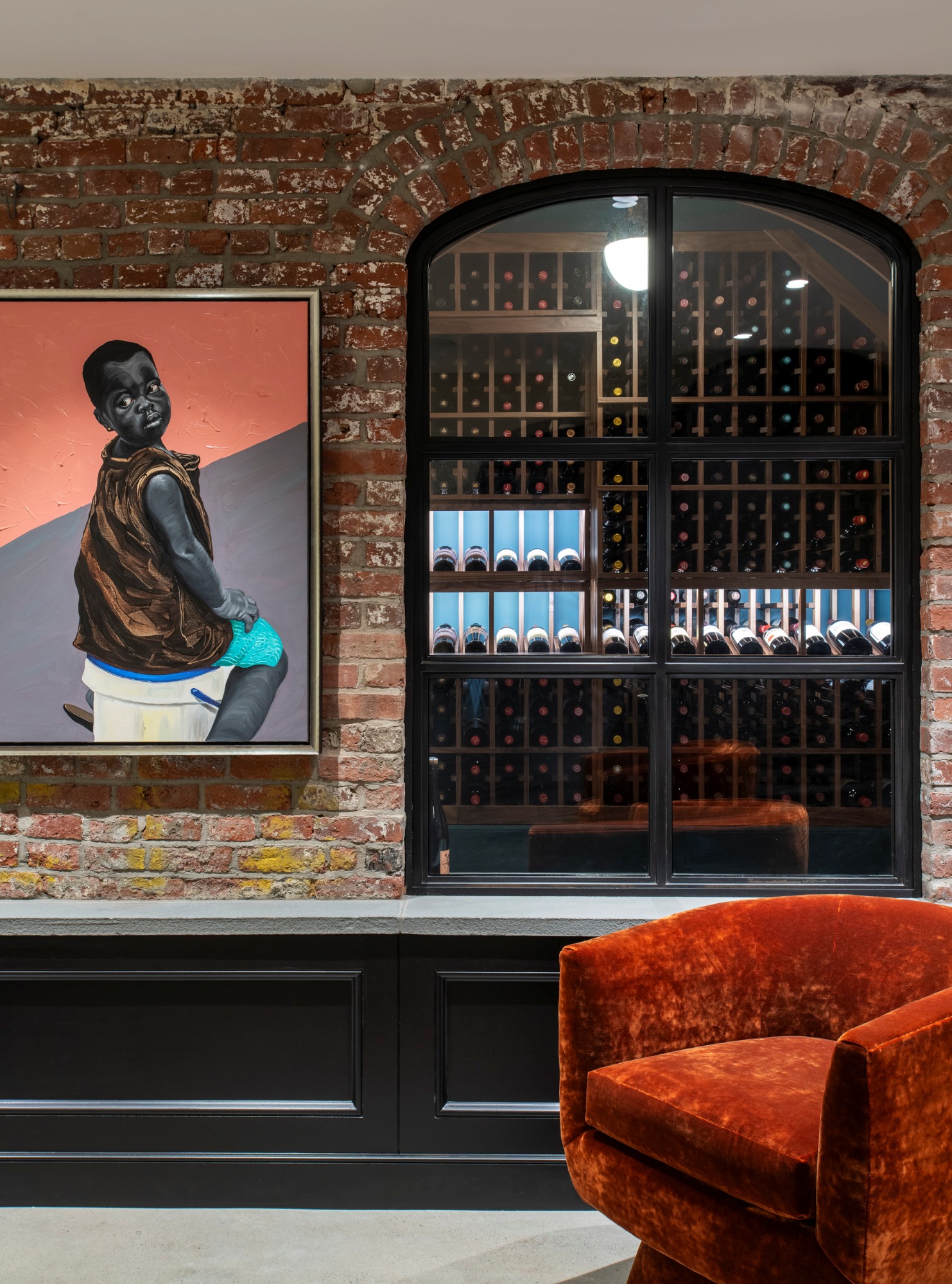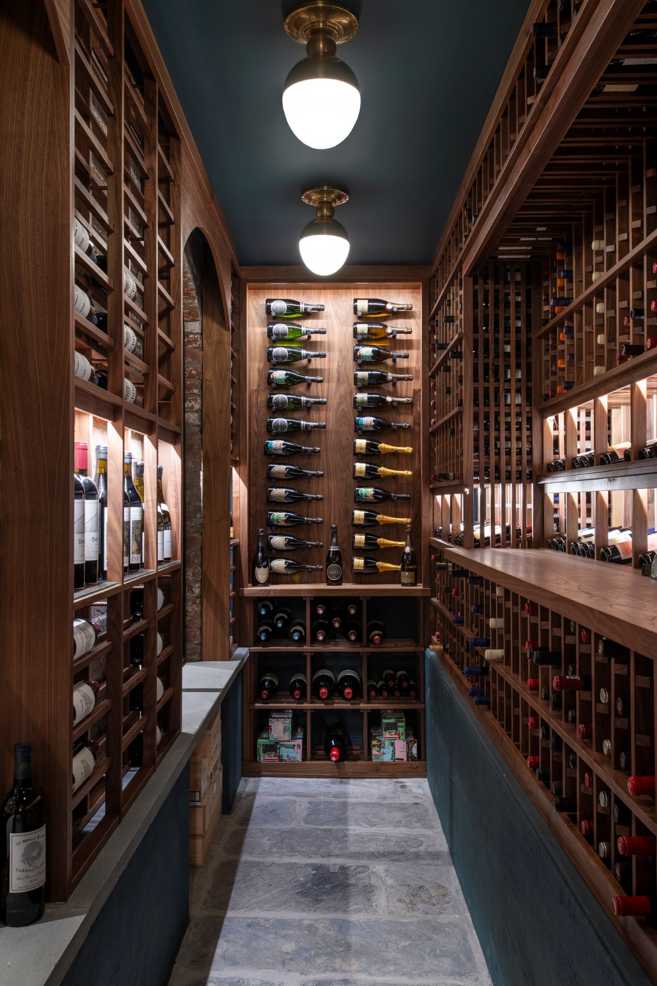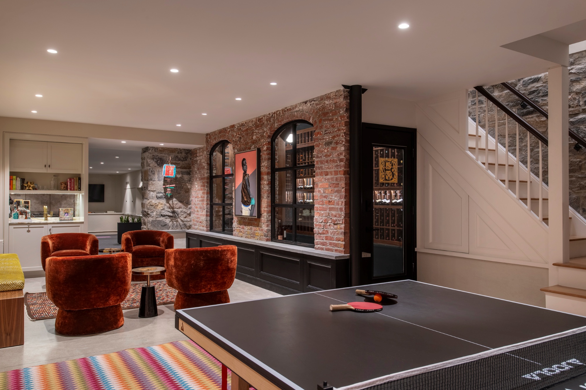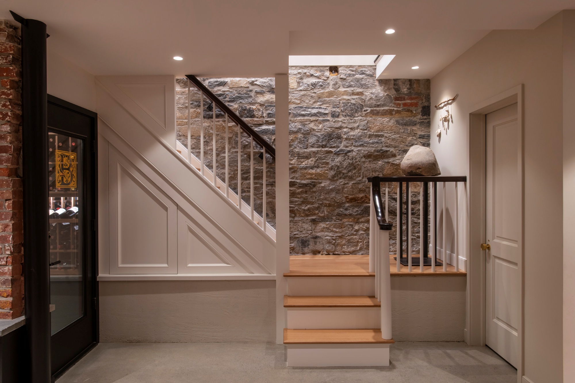 We repointed the original brick archways and left the original stone walls exposed, allowing the home's history to be showcased as the wine cellar walls and along the cellar staircase.