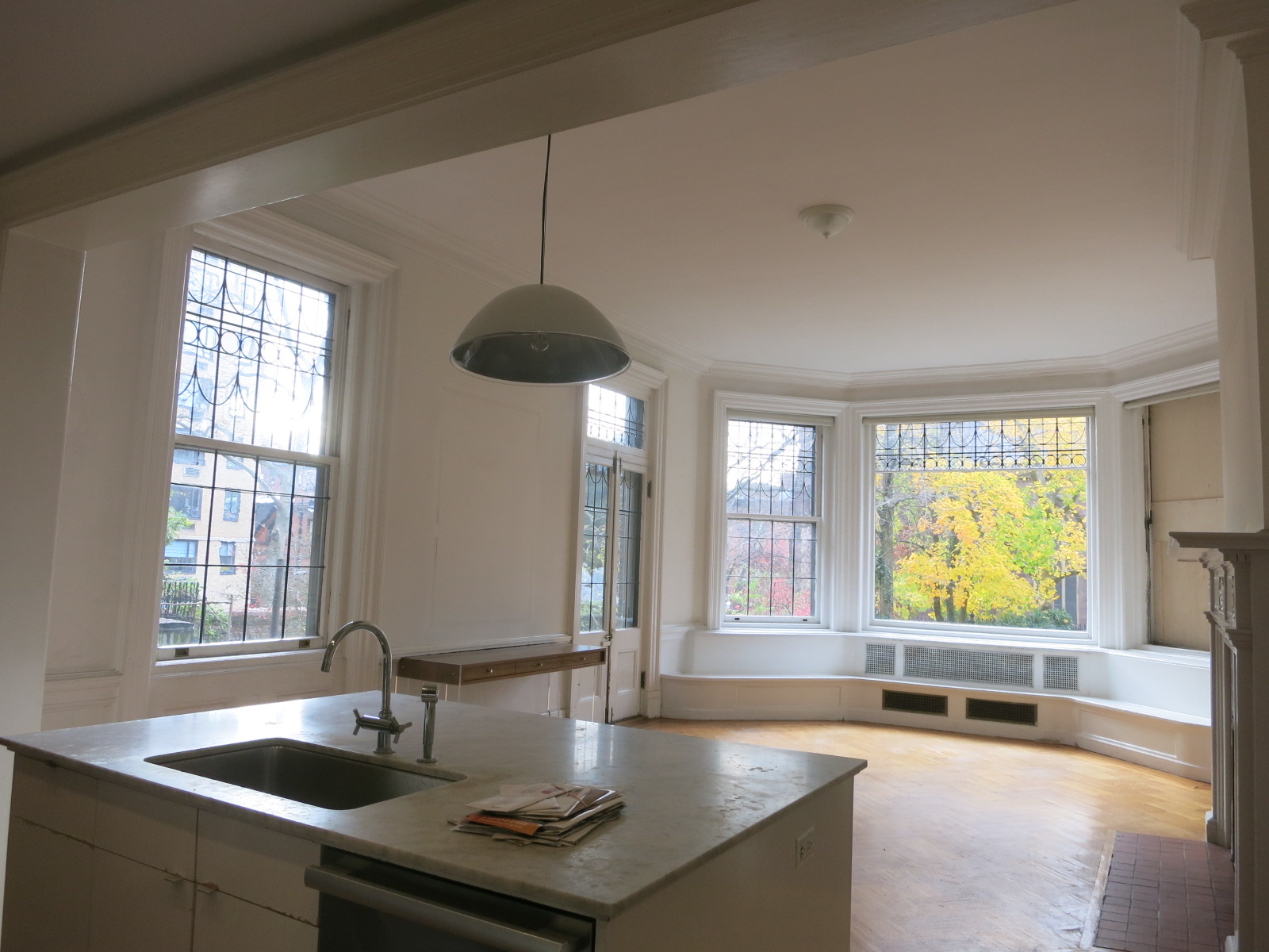 Throughout the parlor level, we spent a great deal of care restoring the historic leaded glass windows, keeping the existing proportions in mind throughout the living room, dining room, and kitchen.