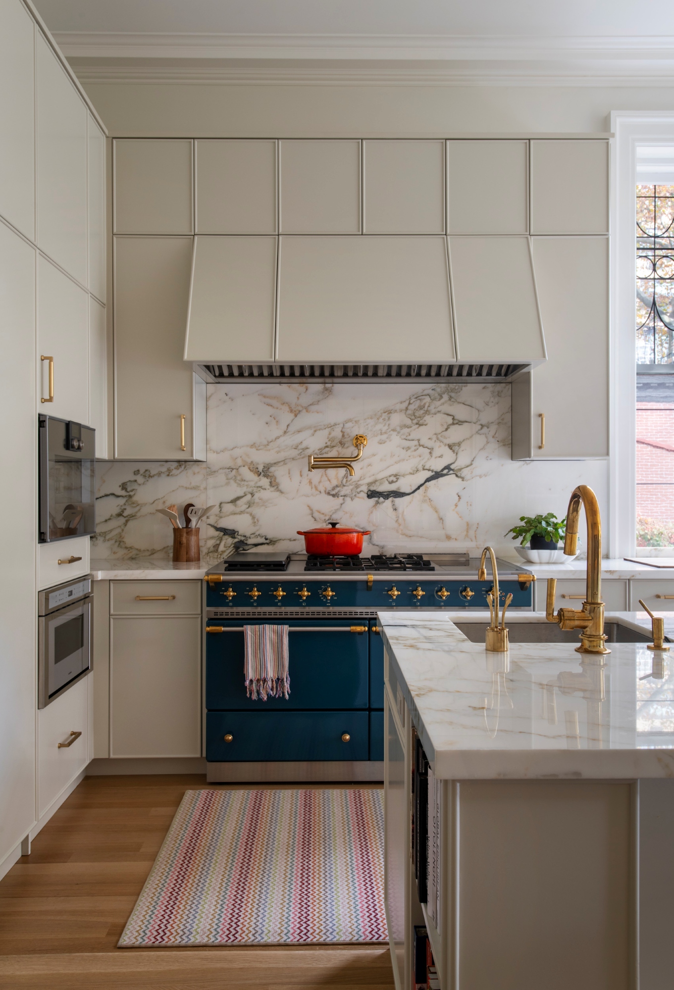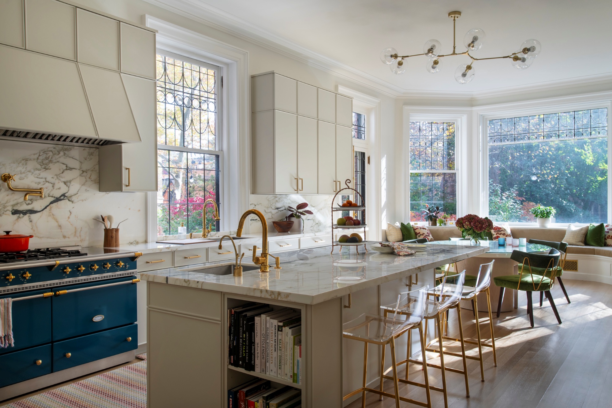 A Lacanche range in blue canard was one of the client's first selections, creating a visual focal point in the bright, sunny kitchen.