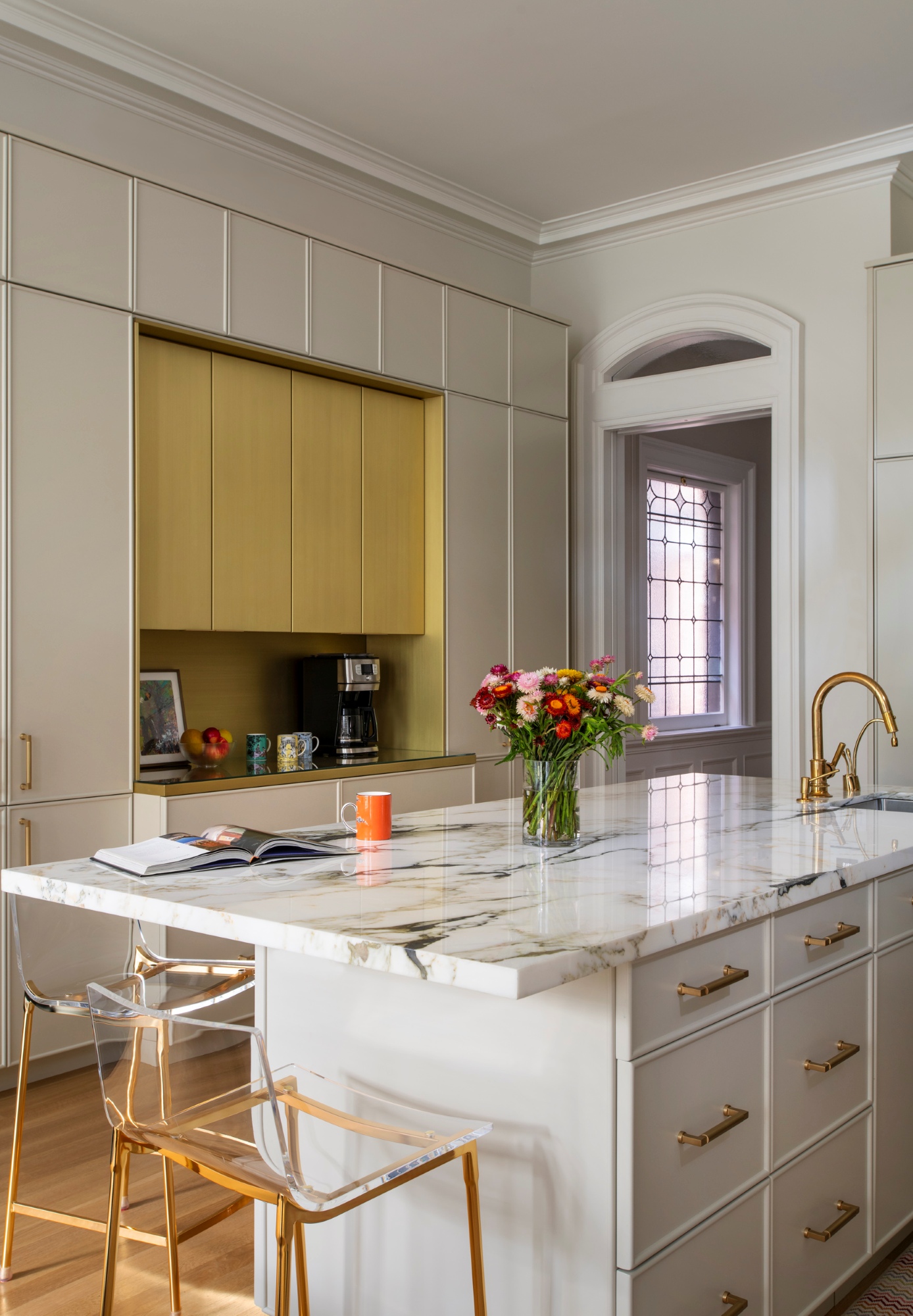 At the rear of the kitchen, restored leaded glass windows and a reactivated bench seat along the bay create a cozy seating area.